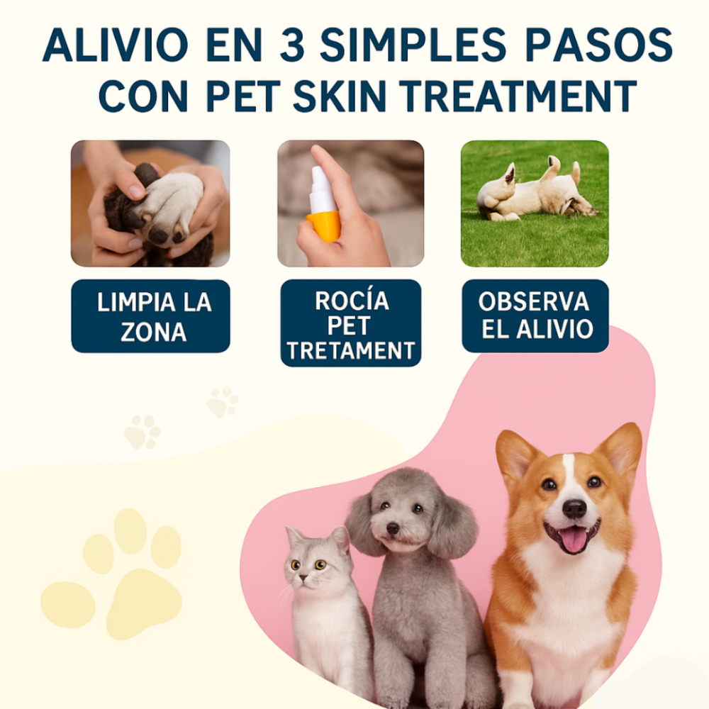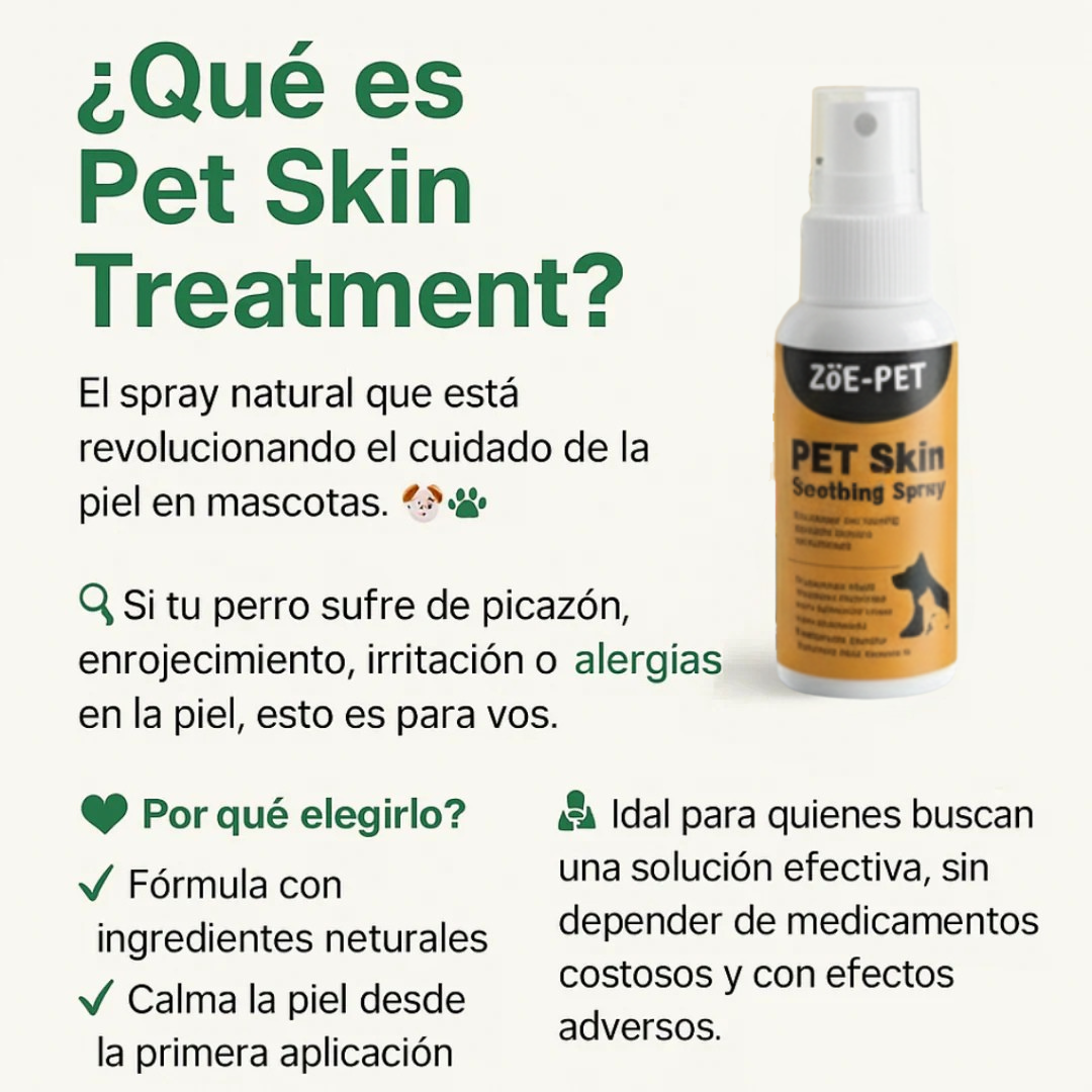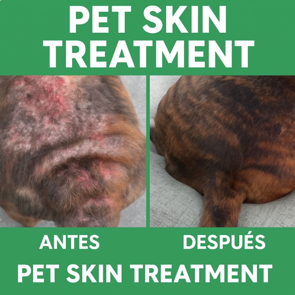 Pet Skin Treatment es un spray regenerador formulado para aliviar la picazón, combatir hongos y bacterias, y acelerar la recuperación de la piel en mascotas. Ideal para perros y gatos con irritaciones, alergias, enrojecimiento, caspa o heridas superficiales. Su fórmula natural y segura calma la piel desde la primera aplicación, sin dejar residuos ni causar efectos secundarios.
